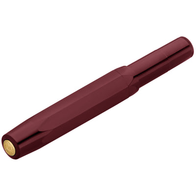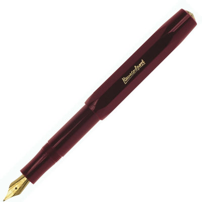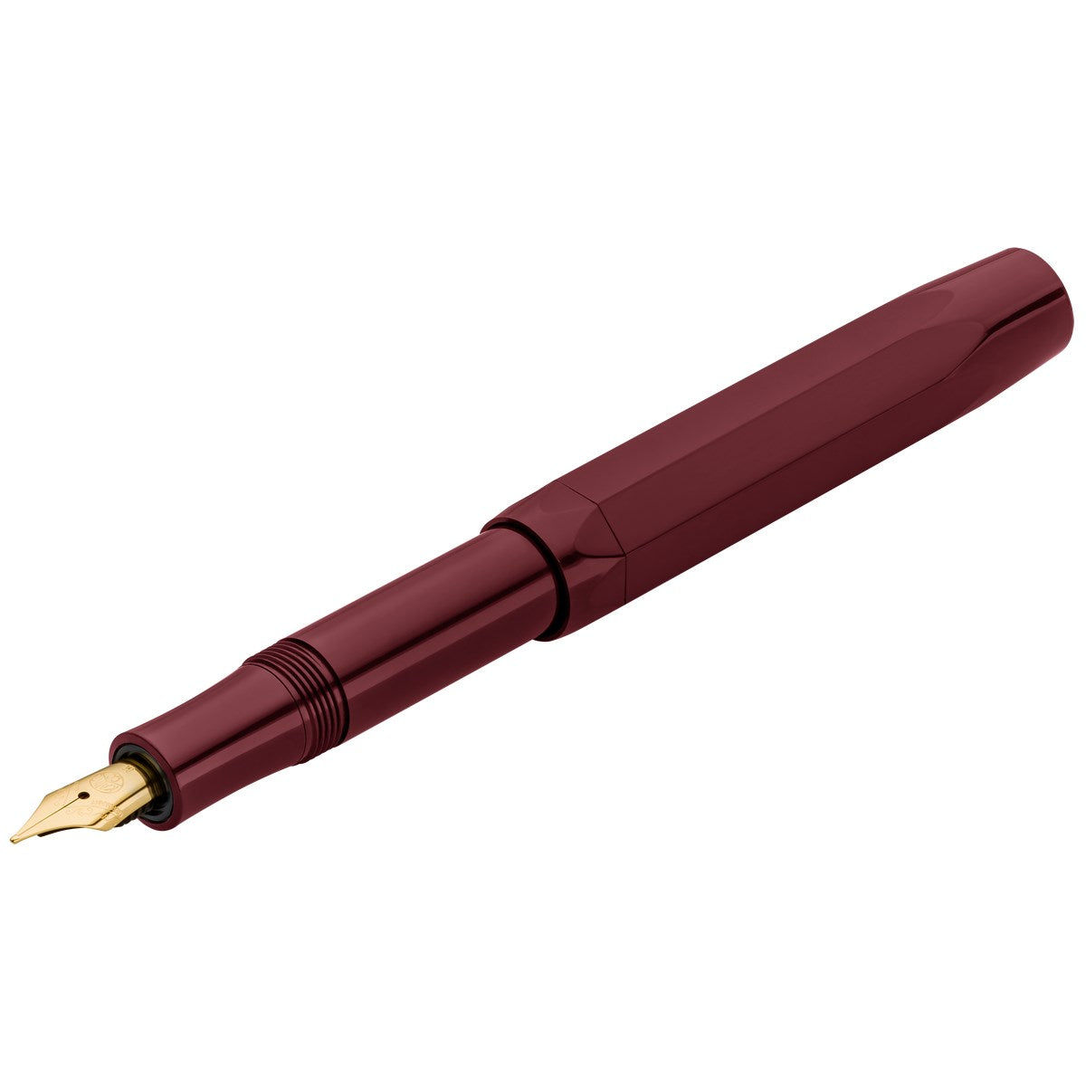 The Kaweco Classic Sport Bordeaux Fountain Pen closely follows an original 1935 octagonal design made from ABS injection-moulded plastic complimented by its gold accents. The gold-plated stainless steel nib is made by Bock of Heidelberg and is available in 5 sizes from extra fine to extra broad. The cleverly thought out oversized cap arrangement creates a small closed pen at just 105mm long but when open emerging into a full length pen at 133mm long.