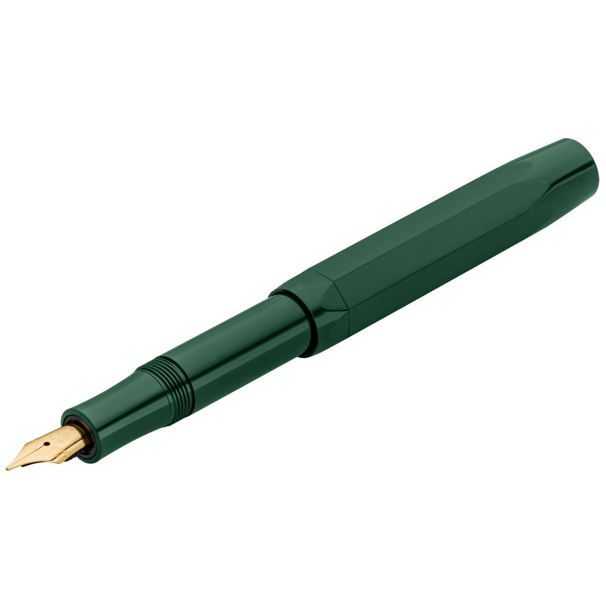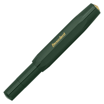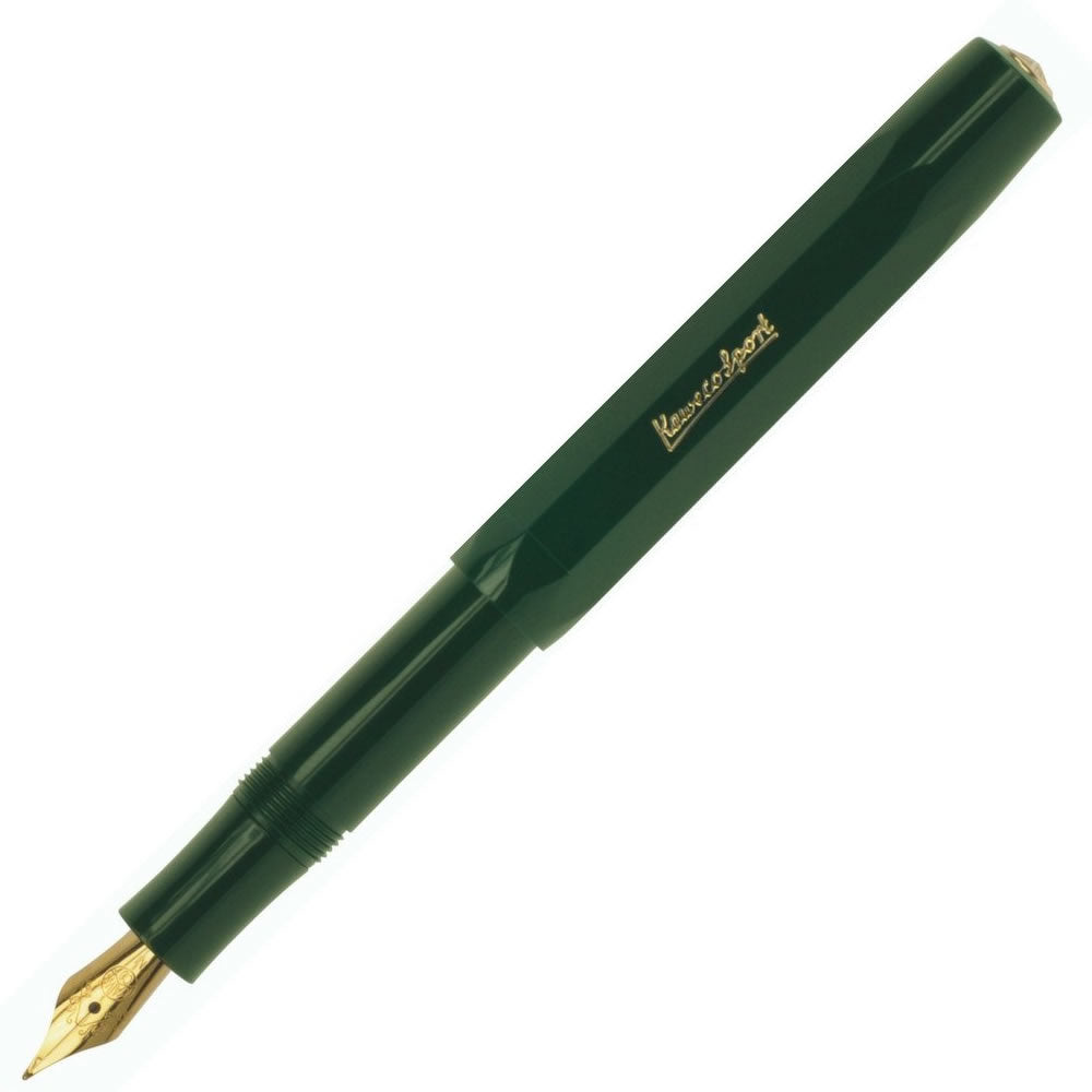 The Kaweco Classic Sport Green Fountain Pen closely follows an original 1935 octagonal design made from ABS injection-moulded plastic complimented by its gold accents. The gold-plated stainless steel nib is made by Bock of Heidelberg and is available in 5 sizes from extra fine to extra broad. The cleverly thought out oversized cap arrangement creates a small closed pen at just 105mm long but when open emerging into a full length pen at 133mm long.