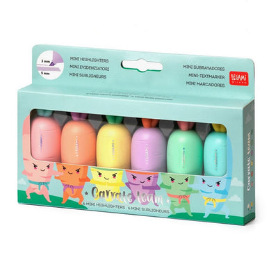 The Carrate Team set of 6 mini carrot-shaped highlighters will add colour to your books and notebooks with sparkling water-based inks.