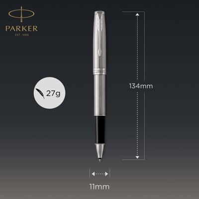A perfect pen set for both men and women this Parker Sonnet Stainless Steel Chrome Trim Fountain & Rollerball Pen Set has an executive feel with its brushed metal finish and heavy weight metal construction. The perfectly weighted Parker Pens will sit ideally balanced in your hand and with the revolutionary smooth Quink flow ink the pen will simply glide across the paper.