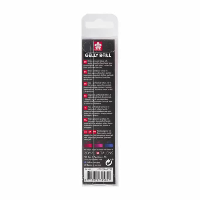 The Metallic family has a magical, shiny effect on white, black and glossy paper. Sakura Gelly Roll Metallic delivers a reflective sheen that is distinct and adds an energetic zest to any writing, drawing or doodle. There is lots of fun to be had writing, drawing, decorating, in scrapbooks, making cards and other hobby applications with Metallic gel pens.
