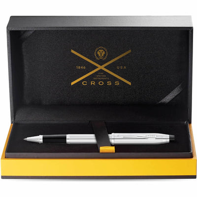 The perfect mix of tradition and progression has brought us the Cross Century II collection, a new take on the iconic Cross Pen which features a broader profile and makes a bold statement. This Cross Rollerball and Ballpoint pen set has been crafted to the highest standard and finished in a high sheen chrome with delicate lined details. The look is finished off by a contrasting black grip section on the rollerball which matches the tip of the pen cap. An engraved Cross pen can make a wonderful gift and these Cross Century II Pens are ideal for adding your own personal touch.