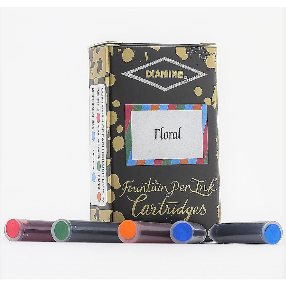 The perfect ink selection pack for when you can't commit to just one colour ink cartridge! This Floral set of ink cartridges by Diamine comes with 4x sets of 5 different coloured inks so you can pick and choose a colour to suit every mood or occasion. This cartridges are International Standard sizes and so do not fit the following pens: Parker, Lamy, Cross and Sheaffer, they may also not fit other brands so please call us if you are unsure.