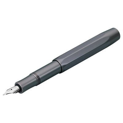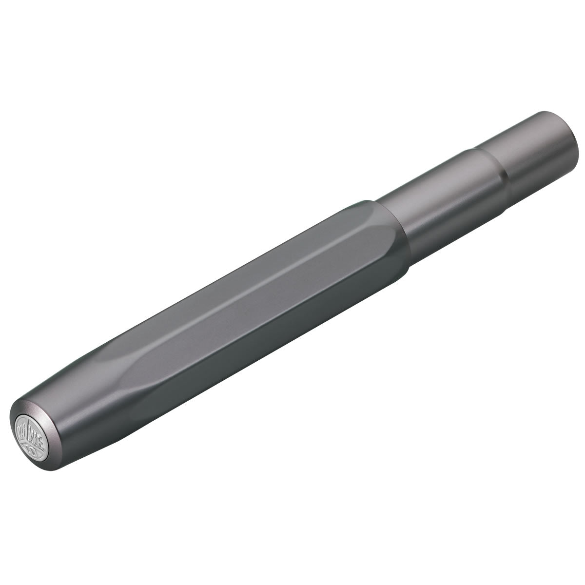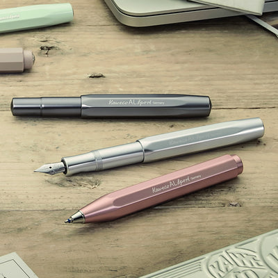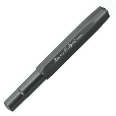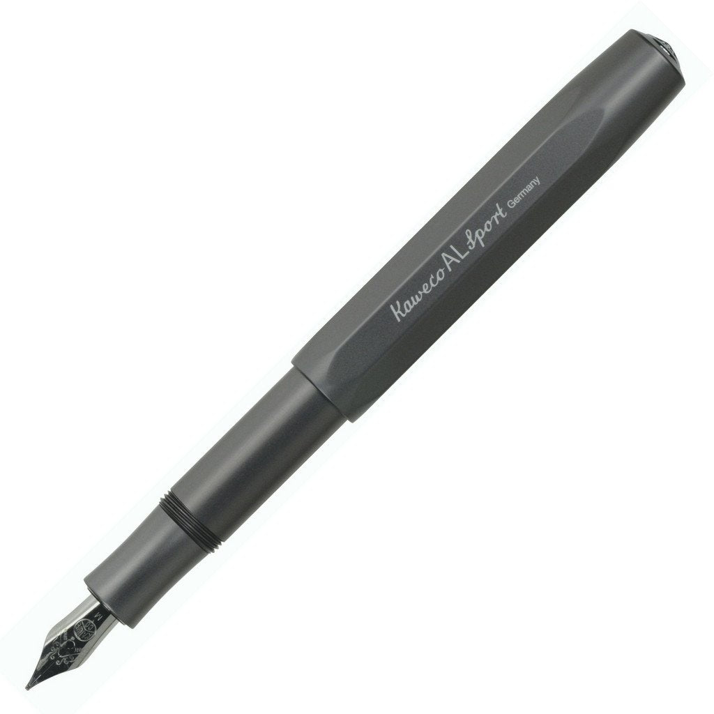 The Kaweco AL Sport Grey Fountain Pen is made from solid aluminium, weighing approximately 20g. Following the original 1935 octagonal design - the oversized cap arrangement creates a small closed pen but a full length open pen with a polished stainless-steel nib, manufactured by Bock of Heidelberg.