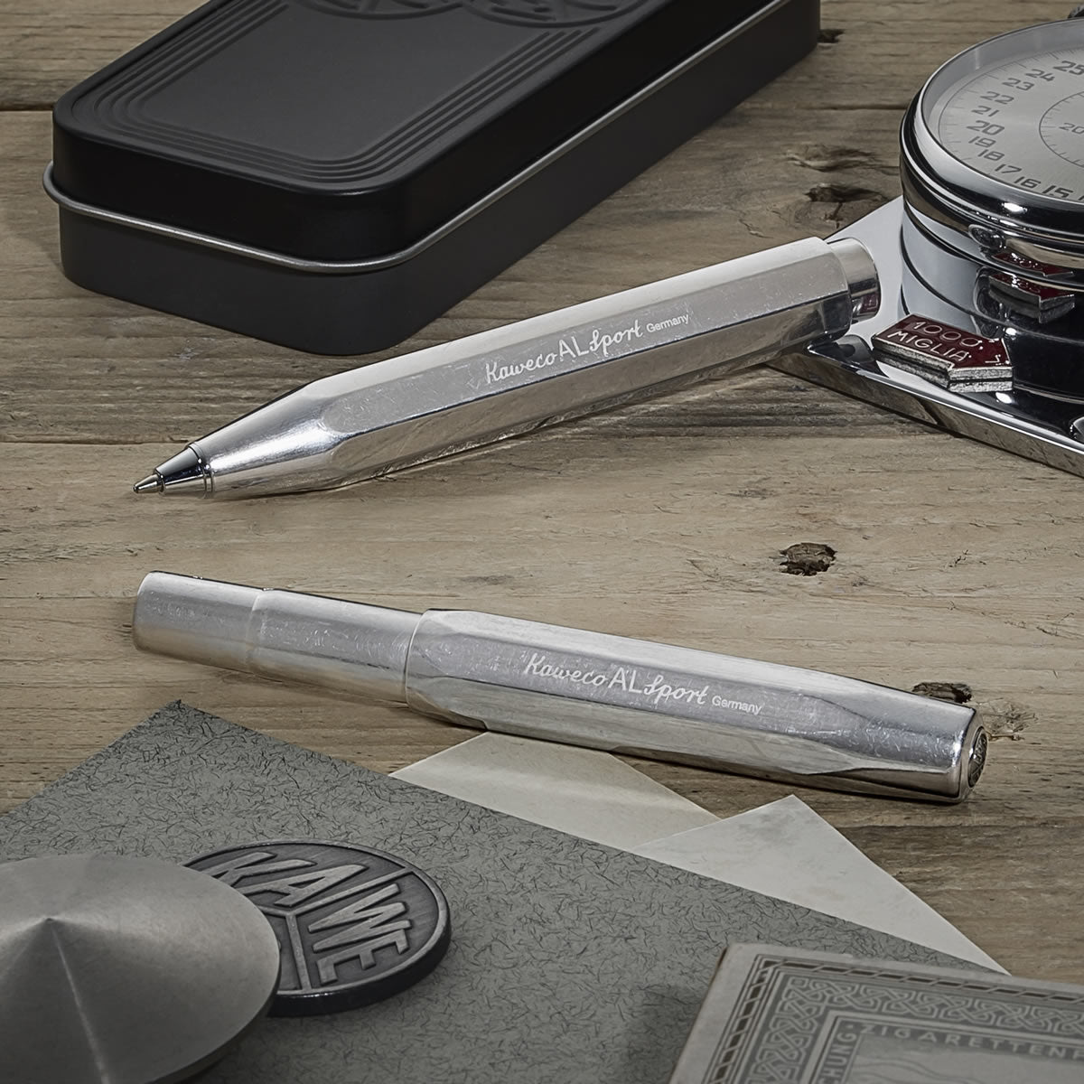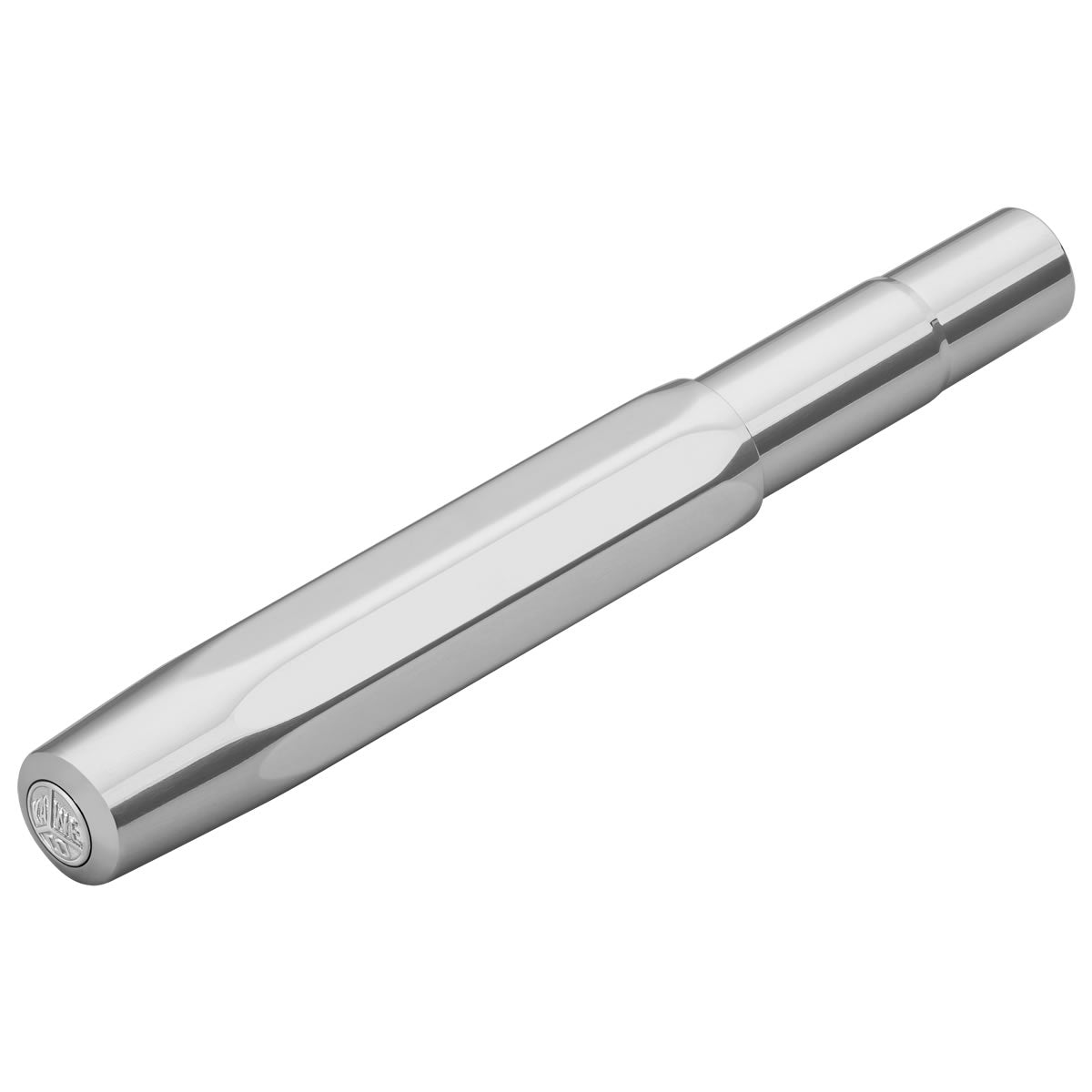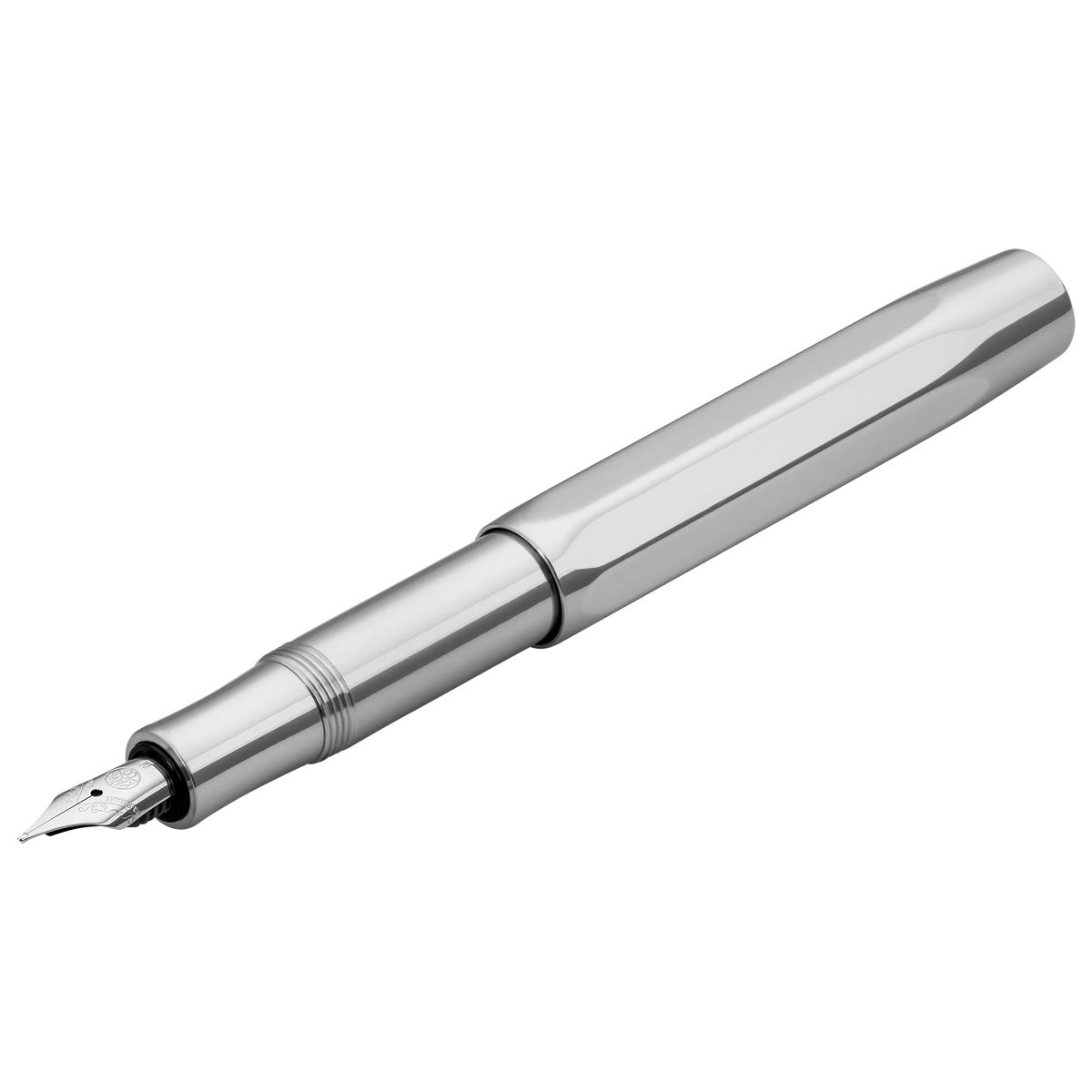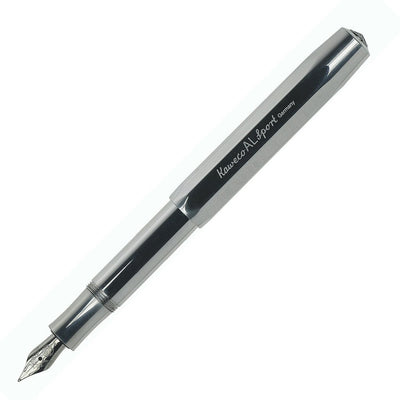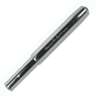 The Kaweco AL Sport Chrome Fountain Pen is made from solid aluminium, weighing approximately 20g. Following the original 1935 octagonal design - the oversized cap arrangement creates a small closed pen but a full length open pen with a polished stainless-steel nib, manufactured by Bock of Heidelberg.
