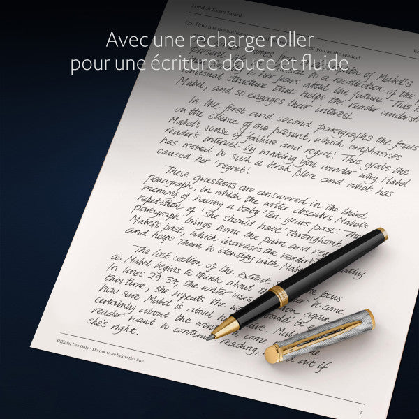 The black lacquered barrel and gold-plated trim of the Waterman Hemisphere pens evoke the romantic charm of a Parisian starry sky overlooking the golden glow of the city's cafés and avenues. Meanwhile, the exquisite wave design of the chiseled palladium-finished cap mirrors the delicate ripples of the Seine River. The expertly crafted rollerball pen tip combines the tradition of liquid ink with comfort and ergonomics. Each pen is meticulously hand-assembled in France, reflecting Waterman's French savoir-faire.