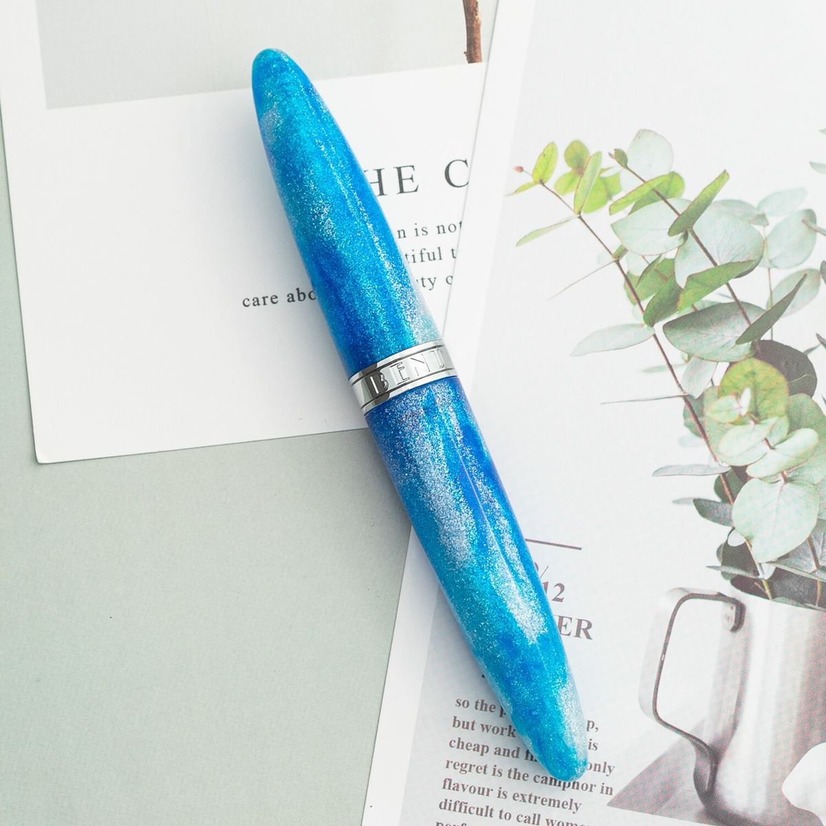 The BENU Minima is compact enough to fit conveniently into small bags and pockets but is still a pleasure to write with. This Arctic Serenity edition has a lustrous metallic blue shimmer cap and barrel that emulates the crisp Arctic Tundra it takes its name from, but don't worry - writing with this pen won't give you frostbite!