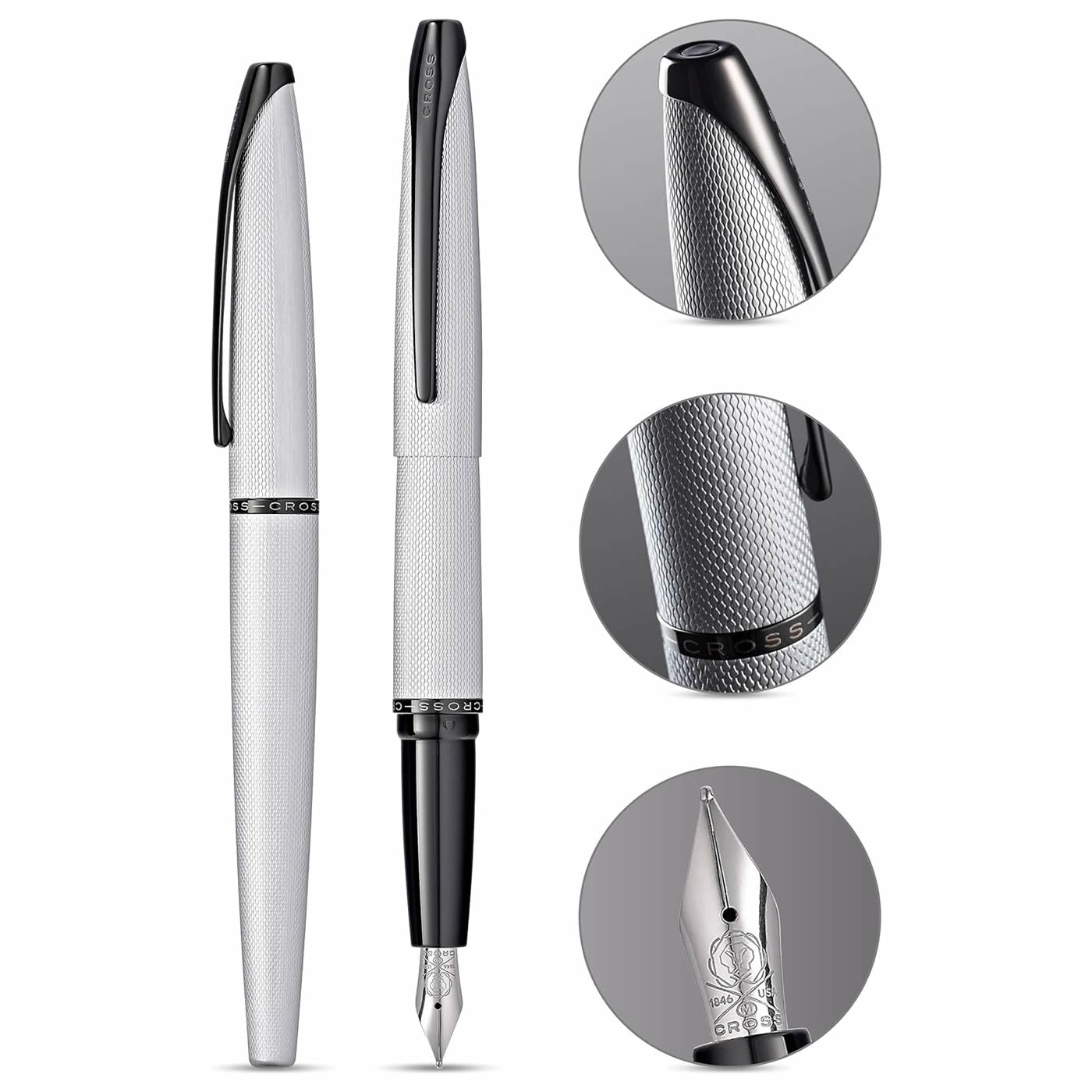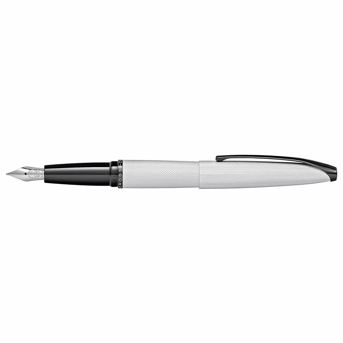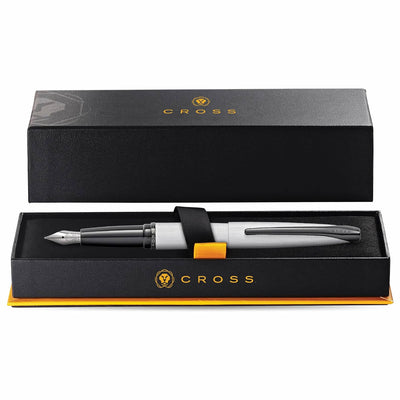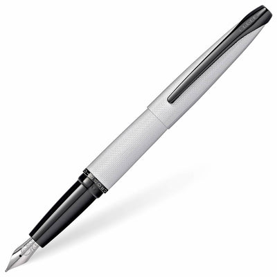 Experience the sleek and symmetrical design of the Cross ATX Brushed Chrome Fountain Pen. Its curved, tapered form is not only visually appealing, but also ergonomic for effortless writing. The modern colour scheme of chrome and black adds a bold touch to this stylish writing instrument. Make it truly unique by taking advantage of our expert engraving service, perfect for gifting to friends and family.