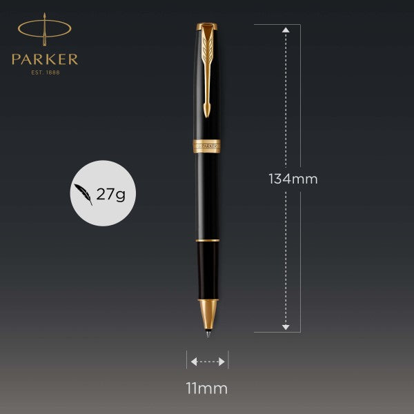 A luxurious statement pen equally suited for both Men and Women this Parker Sonnet Laque Black Gold Trim Rollerball Pen has been hand assembled and quality checked for a flawless finish unrivalled by other pens in this price range. Deep black high shine lacquer is complemented perfectly with bright gold plated trims for effortless style and seduction.